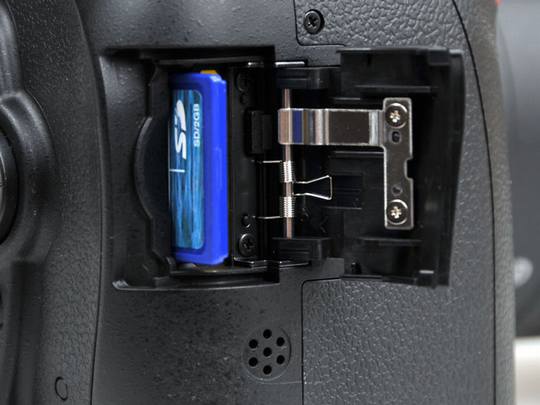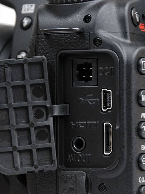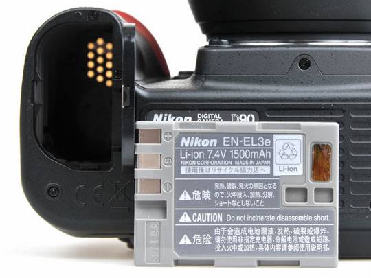 D90沿用了D80使用SD卡的设计,而SD卡插槽的下方有几个小喇叭孔,这是在视频回放过程中的声音出口。电池型号为EN-EL3e,7.4V,1500mAh,与同系列的中端级别产品都可以通用。接口都在机身左侧,这里也和D80有些区别,上面的大块橡胶盖下有四个接口,分别是DC IN、USB、HDMI和AV OUT,而在D80身上显然是没有高清输出接口的,下面的小橡胶盖里也有所不同,以前的D80是不支持GPRS功能的,而在D90身上则加强了这个功能,所以在这里除了快门线外,还可以接GPRS设备,但是由于这次尼康方面并没有提供相关设备,所以无法测试改进型的GPRS设备。