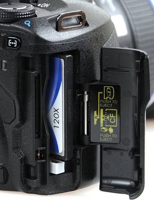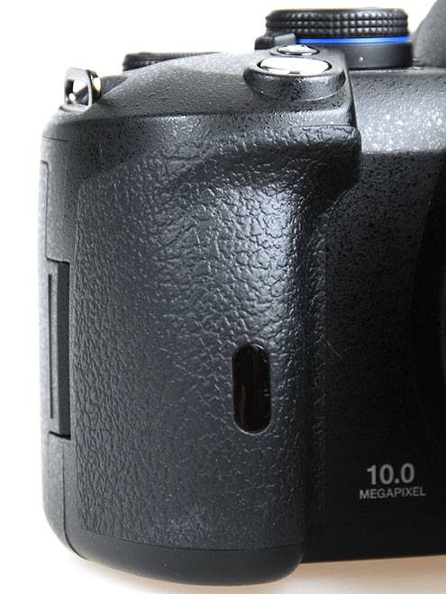 最下面是白平衡、感光度、对焦模式和测光模式键组成的十字键,中间则为确定键。整个机身的数据线接口都集中在十字键下面,橡胶盖内是USB接口和视频输出接口。侧面是存储卡插槽,可以支持xD和CF双卡,电池型号为BLM-1,7.2V,1500mAh,电池为日本产,而机身则为中国造。