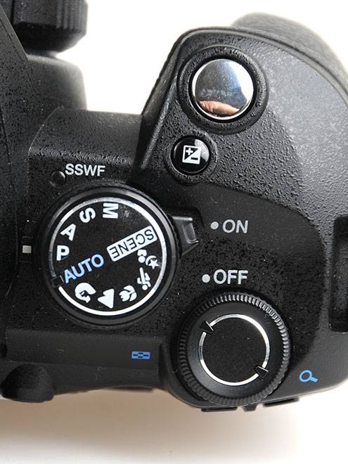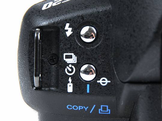 手柄内侧标示着1000万像素的图标,机身正面的右侧标示着防抖标志“IS”,机身顶部的按键是比较集中的,左键上有两个按键,分别是闪光灯控制键和拍摄模式键;右肩部分除了快门按键和曝光补偿键外还有模式转盘和单拨轮。单拨轮在这里负责控制快门及光圈的调节,还可以控制回放中的图片大小,在手动模式下,按住曝光补偿键则可以切换快门及光圈调节。