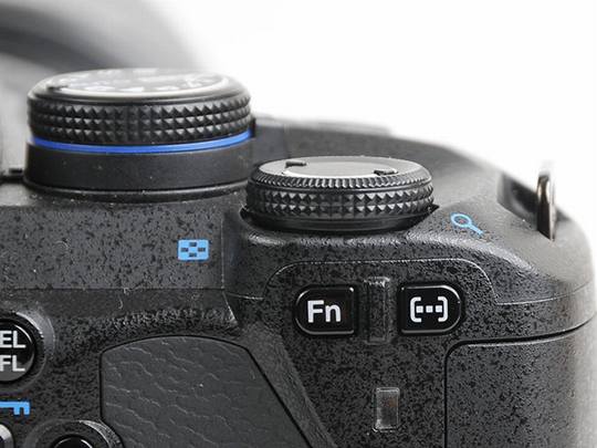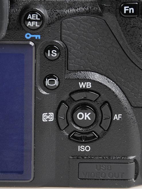 屏幕的右侧按键也比较集中,最上面靠近单拨轮的地方有个FN快捷键和对焦点选择键,而靠近屏幕的地方从上大下分别排列着曝光对焦锁、IS防抖模式键和实时取景切换键,而在这几个按键直接还有块面积很小的蒙皮,正好是右手大拇指所在的位置,可以给持握相机提供不错的手感。