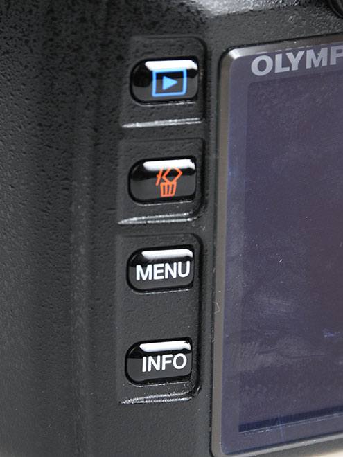 屏幕左侧是竖排的四个按键,从上到下分别是回放键、删除键、菜单键和屏幕信息显示键,按键的设计采用了周围突起的结构,这样在黑暗环境下凭借手指的触觉也可以知道是什么键。