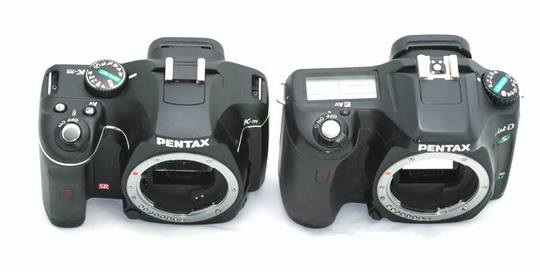K-m取消了肩屏,模式转盘移到了右肩,并且不再象我手头的*istDS,K10D那样是斜装的转盘了,喜欢这种“端正”感。转盘上取消了TAv模式,可能设计者认为K-m的目标用户完全不需要这个模式,而Sv模式得以保留,与Av,Tv,M,P这些模式平起平坐。( )
