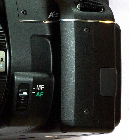 机身接口也简化了,其他机型上左侧那扇小门,变成了更小的一个橡胶盖,打开来只有一个usb口,同时也兼视频输出口,没有快门线插座,你只能用红外遥控器,也没有了外接电源插座。外接电源时需要一个带电线的假电池,放入电池舱,舱盖边有个小缺口,平时用一个小盖子挡住,用外接电源时打开缺口,电线得以通过。感觉这种方式更好,原来外接电源时需要将机身侧边的那个小门大开,既不美观,也有碰坏的顾虑。如果冬天要外接电池盒拍摄,K-m比以前的机器更好用些。