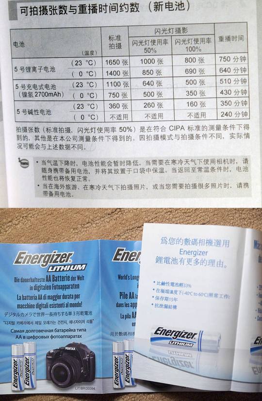 随机配的4节锂电池也是个好东西,无需考虑充电,随时使用,可用期15年,实在太长了,这个指标不是拿来用的,简直是拿来吓人的。设想一下,一个购买了K-m的家庭主妇,可能一年里也不拍几次,但是偶然看到自己的孩子完成一个手工作品,或是疯玩后一个狼狈的样子,忽然萌发出拍照留念的想法,于是把相机翻了出来……这种电池在这种场合真是太合适了,唯一的问题是目前比较难买而且贵。