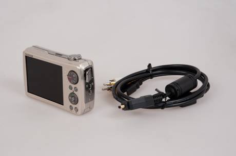 相机旁边有一个插头,平时被一个盖子遮住。分量视频输出需要使用一根随机包装的专用线连接。