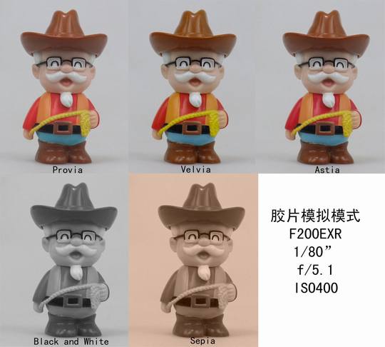 曝光模式除了标准的光圈优先和快门优先以外,还增加了EXR自动模式和场景模式(人像、夜景、微距、风光、夜间人像和背光人像)等。带有多年生产胶卷传统的富士在多款数码相机上都有胶片模拟模式,在F200EXR也不例外,具有普罗维亚(Provia)、维尔维亚(Velvia)、(Astia)、黑白、棕色等模式。