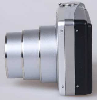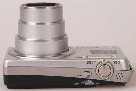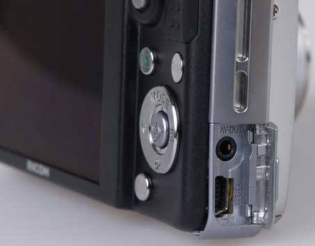 机身前面设计的比较简洁,硕大的7.1倍光学变焦镜头占据了前面一半的空间,这支镜头的135等效焦距为28-200mm,和以前产品的指标一样,光圈范围f/3.3-5.2,1cm微距功能也始终保持着。不过从R6开始,这个系列在场景模式中又增加了一项叫做变焦特写的功能,实际上就是超级微距功能,不过这个功能只能在广角端实现,在使用变焦特写功能时相机是不能提供变焦的。这支镜头还是采用了理光引以为豪的双回缩系统,这种后组镜头可移动的设计保证了该系列相机在使用大变焦比镜头的同时还能够保持小巧的身材。镜头的左上侧是闪光灯和对焦辅助灯,这个系列相机的闪光灯在全光输出的时候光量非常大,在近距离使用时要特别注意,要多使用几次才能掌握好拍摄距离、焦距与闪光量的比例。下面黑色铭牌上标注了这款相机的特色:28-200mm焦距、7.1倍光学变焦、820万像素CCD。