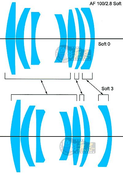 AF 100/2.8 Soft的光学镜片由三部分组成,第一部分(前5片镜片)是Xenotar结构,通过改变第二部分和第三部分的间距来控制残余球差,调节柔焦效果,由此产生的焦点漂移则通过第一部分的镜片移动来补偿。由于要补偿焦点漂移,所以该镜头在清晰位置的视角是最窄的,而在Soft 3的位置时,视角最大。