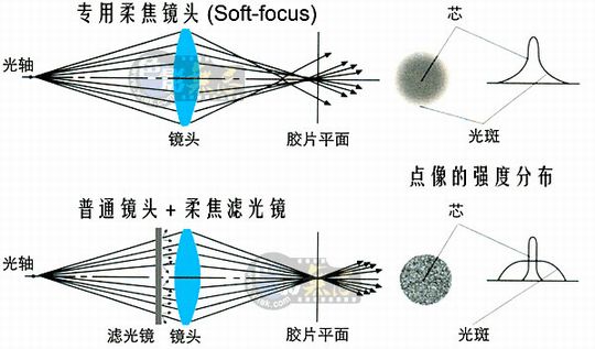 这种专用柔焦镜头与普通镜头+柔焦滤光镜的的区别是:柔焦镜头是通过调节可控残余球差来控制虚化的,此时除球差以外的光学像差同普通镜头一样获得良好的校正,所以能够获得有“芯”的虚化效果。而通常柔焦滤光镜的效果只不过相当于在镜头前端放置了一块毛玻璃,所得到的画面整体虚化而没有“芯”。