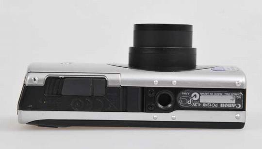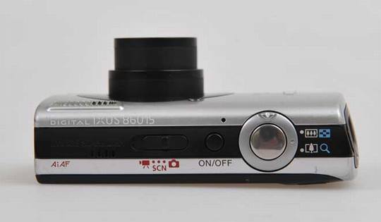 机顶部分是拍照模式、场景模式和摄像模式切换键,快门按键周围还是集成了变焦杆,这是佳能IXUS的特色,上面还有话筒和喇叭孔。