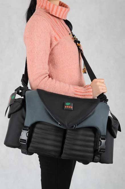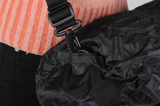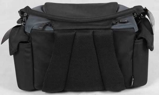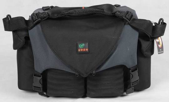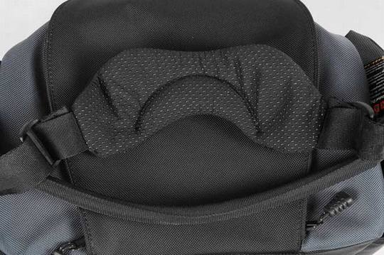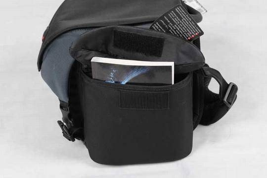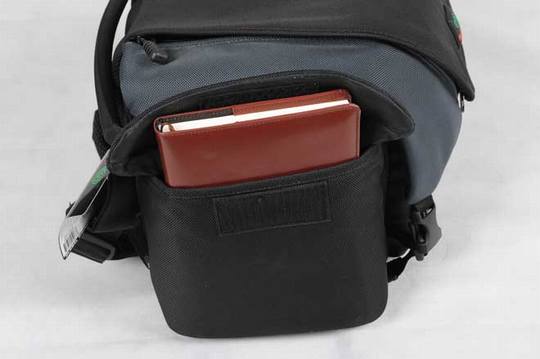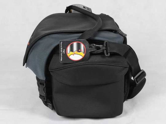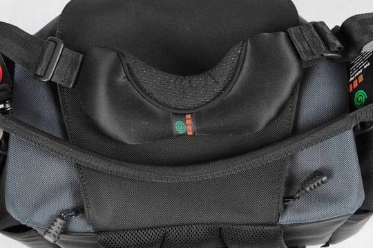 前袋和侧袋都使用了TST(Thermo-Shield-Technology)热防护技术材料,两个前袋的外层都采用半刚性设计,具有相当的硬度,可以提供比较有力的保护,而且前袋的空间比较大,对于一般的数码伴侣甚至是小体积镜头都可以装下。两个侧袋的体积更大,同时提供了大面积的外盖,采用尼龙搭扣设计进行密封,有足够的空间盛放物品。