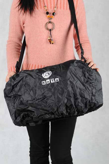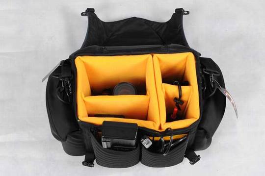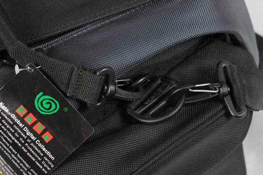 主袋内部具有内衬工具包,分隔板和可拆卸加固底板,可以选择使用其中的一些、使用全部、或都不使用上述器件,从而决定背包的刚度和灵活性(如果需要进行额外分隔,则可以采用KATA的模制多功能(Modi-Vers)分隔套板)、 背包上方设置的特殊顶部安全背带可以在背包未装满至最大状态的情况下减少占用空间。工具包分为两个空间,还提供了四个大小不等的套模制多功能(Modi-Vers)分隔套板。当然,主袋内也提供了一个网状镜头袋和一个银黑两色的双面防护罩。与其他的双面防护罩不同,由于是单肩摄影包,所以这个双面防护罩在左右两个上角的地方分别设计了一个13cm长的开口,封口出用尼龙搭扣连接,这个开口的作用是在摄影包套住双面防护罩后可以把背带从这里穿出来,是个很人性化的设计。