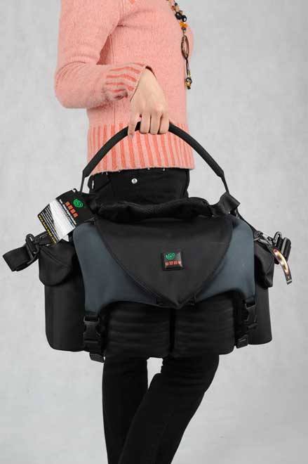 这款SB-904实际上和普通的单肩摄影包体积差不多,但是由于包体很多地方都使用了半刚性材料,所以整个包看起来鼓鼓囊囊的,显得体积比较大。除了上盖的外围部分,包体都采用了黑色面料,由主袋、两边的侧袋和两个前袋组成,其材质也是使用了TST(Thermo-Shield-Technology)热防护技术,该技术是目前最新的技术解决方案,外部表层经过热塑Thermo-Formed处理形成波浪形状,除了采用超韧尼龙(SuperNylon)原材料外,还使用了双线交叉纺织方法来增加背包整体的韧性及紧密度,使防水、防尘和耐用度都有所提升。另外为了提高背包的减震效果,KATA在其背包表层内增加由PE+EVA两种材质交错组合而成的吸震层。PE是目前工业及生活上应用最广泛的塑胶材质,EVA则是鞋类衬垫内部普遍使用的军用海棉材质,两者搭配组合可以提供隔热、耐寒、防潮及高度防震的多重防护效果。