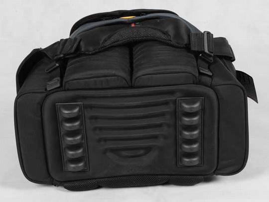 背包背面紧靠身体的一侧有很厚的海绵衬垫,并且有一个用于额外支持作用的可拆卸腰带,该腰带同时还可以用于将拉杆车装设于背包上。底部两侧各有一排硬塑料材质的垫子,可以保护背包底部不会接触地面,从而避免磨损,而中间部分也进行了加硬设计。
