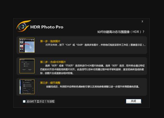 可以说,这是一款非常简单的软件,根据软件运行后的说明,基本上,分为3步,我们就能获得需要的HDR效果的照片了。不过,在这之前,我们需要固定机位,对着同一物体/场景拍摄3张照片,分别需要加一档、减一档和正确曝光。然后就可以通过HDR Photo Pro这款软件来合成出一张HDR效果的照片。