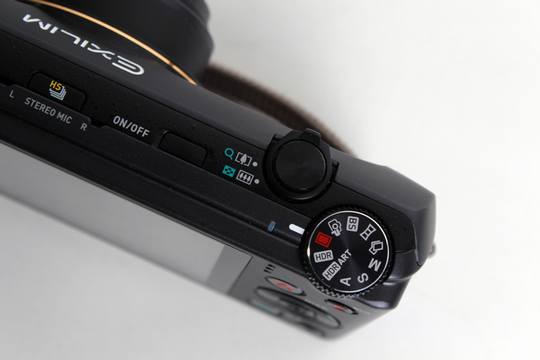 机顶部分的变化,属于比较明显的。在保留了HS高速模式按钮之外,增加了模式拨盘。这一设计在其他品牌中并不鲜见。而这种设计在卡西欧的卡片相机中其实并不多见。依稀记得近两年只是在FH100中有出现过。但是事实证明这样的设计确实在应用性上要比前作好许多。用户可以更为快速调节相机,以便于更快速的拍摄出自己想要的照片。