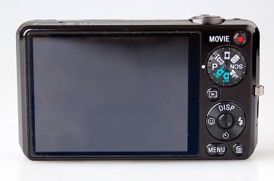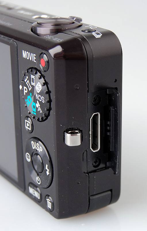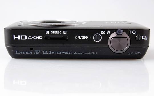 由于不是触摸屏操作的机器,所以我们看到,在体积较小的WX5上还是排列了较多的按键,顶部开关,快门,变焦环和连拍切换键一字排开,而AVCHD的logo非常醒目的告诉用户,这是一台支持1080全高清视频拍摄的相机。而左右声道的麦克风设计也能在这样小巧的机器上获得较好的音质水准。