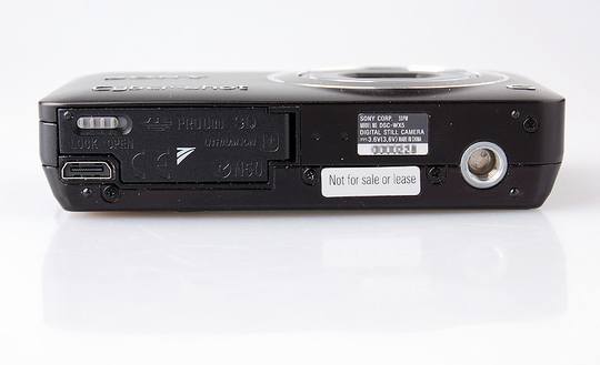 在相机的底部,我们可以看到WX5搭载了索尼今年全新推出的无线传输Transfer Jet 技术,配合支持Transfer Jet技术的记忆棒,2台支持Transfer Jet技术的设备(相机、笔记本等)可以在互相传输照片,每次最多传输10张照片左右。