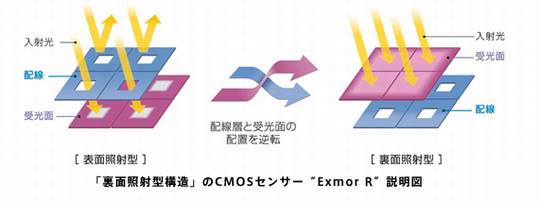 但TX1的“背面进光”Exmore R CMOS 影像传感器,才是这款相机的最大特色。从资料获悉,这款图像传感器在感光度和降噪上都比从前的产品高出约2倍的性能。它与之前的表面照射型COMS构造不一同,他将原来放在金属线路和晶体管背面的硅基板改置于前面,让光照射到硅基板上并在内侧积累电荷,从而形成电流通路(如图)。由于不金属线路和晶体管的阻碍,大大增加了进入每个像素的光量的同时可以根据光射入的角度不同有效抑制感光度的降低,从而来降低高感光度和低噪点。