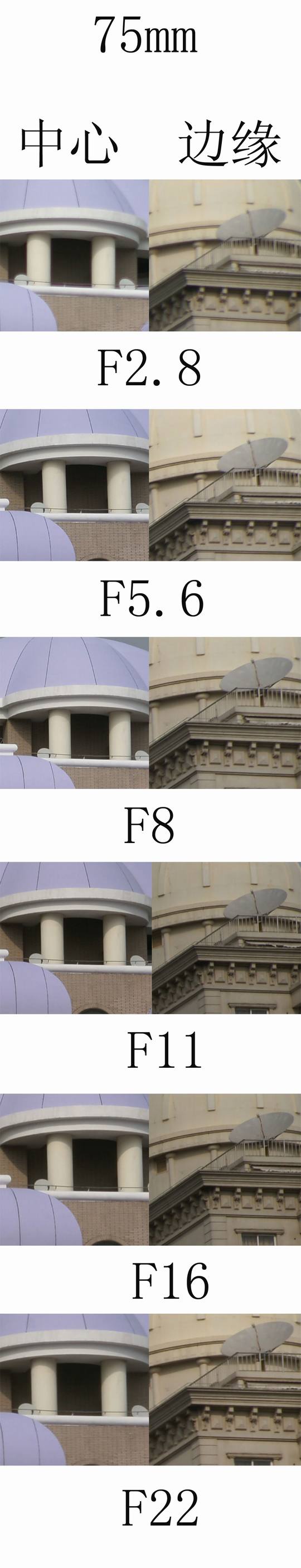 镜头在28mm端有相当大的桶形畸变,随着焦距的增加畸变越来越小,75mm时的畸变相对而言则没有那么厉害。