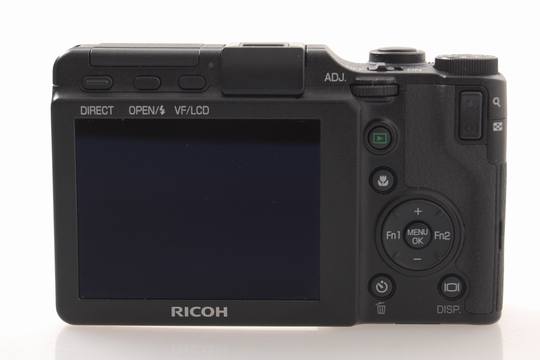 与前部不同,机背部分则几乎和理光GRD系列相同。按键分布也较为类似,方向键、ADJ杆和功能按钮等。3.0英寸LCD(92万点)高分VGA液晶屏,拥有宽广的可视角度和高对比度,属于目前比较高端小数码的标配。显示屏上有一层防污的氟涂层,一层防刮的硬涂层以及一层防反光的涂层,让屏幕即使在明亮的阳光下,也有很好的可见度,且色彩再现的范围覆盖了100% sRGB。从这点我们便可以看出这是理光的一款用心之作。