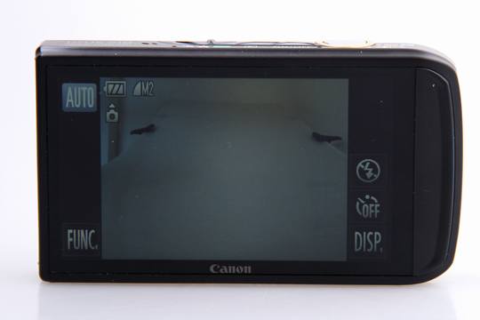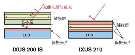这些按键放置在顶部显然不符合佳能的传统设计风格,但意图很明显,是为那块3.5英寸全触屏液晶屏让位。这是佳能首款采用分辨率高达46.1万点的3.5"宽屏(16:9)数码相机。当然“晶炫II”的技术也被融入其中。“晶炫II”的优势在于它将触摸面板与液晶(偏振光片)粘合在一起而不留一点缝隙,首先实现了相机的轻薄化,其次也抑制了LCD的反射光,大大提高了可视性。显然佳能的首次尝试就已经尽可能的面面俱到了。