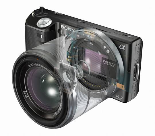 首先是这次评测的主角NEX5。NEX-5配备了1420万像素Exmor APS HD CMOS 感光元件,采用全新设计的E mount 镜头卡口。取消传统单反相机的五棱镜头以及取景器,实现轻量、精巧的可更换镜头数码相机。机身背面搭载92万像素3.0英寸可翻转液晶显示屏。