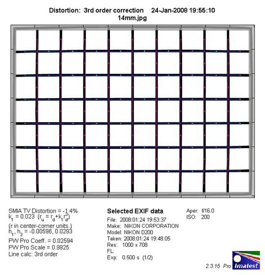 虽然说这款镜头只有1.7倍的变焦倍率,在APS-c相机上焦段只有21-36。但仍不可否认这是一款超广角镜头。桶变是其难以避免的测试之一。然而我们可喜的看到这款镜头在14mm焦段桶形畸变只有1.4%,这或许要归功于尼康卓越的控制技术。至于18mm以及24mm这种畸变几乎已经完全可以忽略不计。