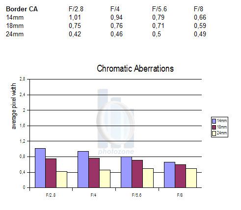 接下来我们进行一下色差比较。横向色差(色彩阴影过度的严格比较)即使在14mm段的表现也相当不错。只是在1px(像素)图像的边界上又有些许问题存在。但只是一个特例.在18mm 24mm又是一个完全可以忽略不计的书数值。但严格来说这一问题完全不会影响到我们的拍摄。