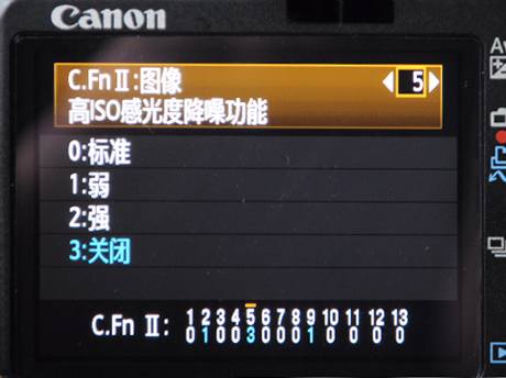 菜单中,可见EOS 500D有4个降噪选项,分别为:关闭、标准、弱、强。