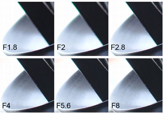 可以看出,该镜头只在F1.8端可看到暗角,当光圈收到F2.8之后,已经看不到暗角现象。但镜头桶形畸变比较明显,肉眼已经容易可以看出变形。当使用Imatest软件计算得出TV Distortion值竟达-2.61。当然,在物理上毕竟是35mm的镜头,畸变是还是在所难免的。