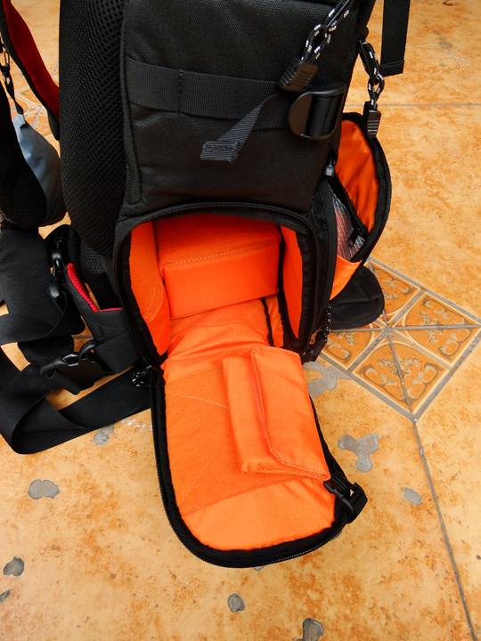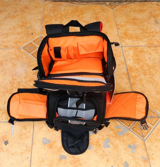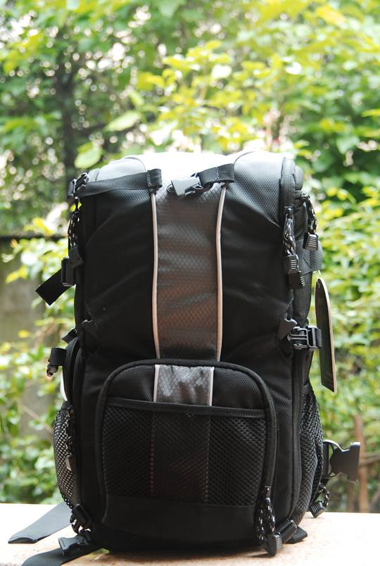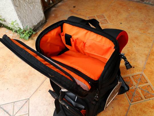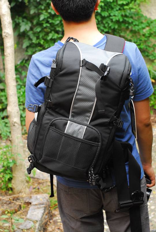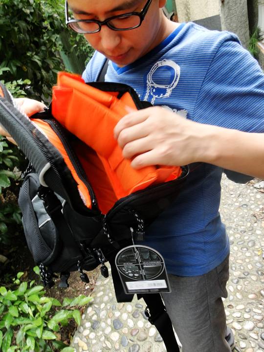 而从构造上,摄影包顶部的是独立的储物空间,里面可以放置一些简单衣物或者摄影周边诸如遥控器,存储卡、或者笔记本之类。空间并不是非常大,所以能容纳的相对有限。但是底部拉链可以打开,以此让整个摄影包上下得以贯通。让用户自行取舍究竟是放置更多摄影设备还是周边必须品。