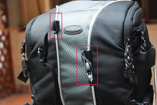 该款摄影包除去多样式的背负方式、三种开启方式这些亮点之外,想来可调式滑轨的脚架搭扣应该也是亮点之一。他可以根据不同的脚架设置不同的长度。