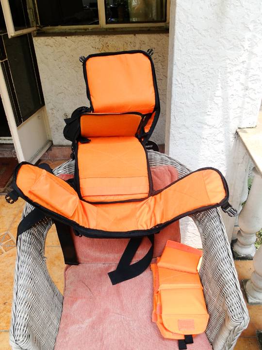 材质上C系列摄影包仍然采用了进口尼龙面料、美国UTX-DURAFLEX扣具和日本YKK拉链。摄影包内部颜色为橘红色。非常鲜明。摄影包的肩带以及背面都采用到了相对舒适的类似海绵垫的材质。在背部特意的加厚让背负较为舒适,符合人体工程学。