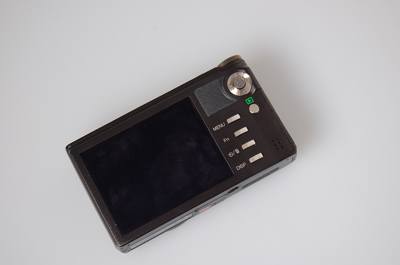 机身背面按钮排列的非常整齐,这是目前的小DC上并不多见的排列方法,个人感觉比较耳目一新。最上方是五维导航键(能设置包括微距、闪光灯以及曝光补偿等功能在内的多项设置。)下方是播放按钮,除此之外仿皮质握键下方分别纵向排列着包括MENU键、Fn、以及删除/自拍和DISP等其他功能按键。背面左侧被一块3英寸LCD显示屏所占据。92万像素让菜单现实起来非常清晰。