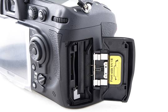 双卡槽设计,能支持CF卡、SD卡和SDHC卡。和D3系列的双卡使用方式相似,用户可指定一个主卡槽。而为第二卡槽选定存储方法:“额外空间”指在主卡已满的情况下自动用副卡存储数据;“备份”指在两张卡上同时存储相同内容;“RAW 主插槽,JPEG 第二插槽”指把 RAW 和 JPEG 数据分开记录到主卡和副卡上。同时,还可以互相复制两张存储卡上的图片。