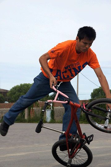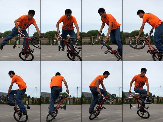 高速连拍是α550的主要特点之一,采用先进的相位检测自动对焦技术和BIONZ影像处理器,它可以在实时取景下实现4张/秒的高速连拍,如果使用光学取景器连拍可达5张/秒。如果这还不能满足您的需求,我们可以选用速度优先连续拍摄模式,那么连拍的速度就高达7张/秒。它的基本原理是在拍摄第一张照片时就固定了曝光和焦点。这次试拍特别邀请了BMX原地花式小轮车的全国冠军进行表演,为了显示α550的优势,我在拍摄小轮车表演时都使用了这种高速连拍的模式。现场试用的记者也全部使用高速连拍,车轮旋转,清脆有力的快门声响成一片,其场面相当壮观。高速连拍可以轻松地捕捉这些运动的瞬间,但是缺点也很明显,就是不能进行连续对焦和测光,运动主体经常会跑到焦外。我选取了其中四段资料,制作成了GIF动画,还特别选取了其中一则将分解的图片一一呈现。