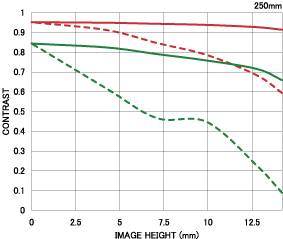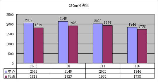 由图可看出该镜头有着不错的分辨率,最佳光圈在f5.6到f8之间,而当焦段伸长到250mm的时候分辨率下降还是挺大的,这也正和官方公布的曲线相匹配。毕竟是大变焦镜头,方便之余难免会牺牲一定画质。