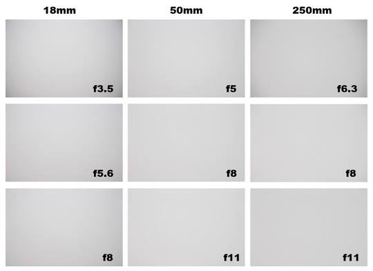 适马18-250的暗角控制还不错,18mm在F3.5和F4时有比较明显的暗角,F5.6时暗角就已经很微弱,50mm未看到暗角现象,长焦端在F6.3时能看到明显暗角,F8开始,已经察觉不到暗角。