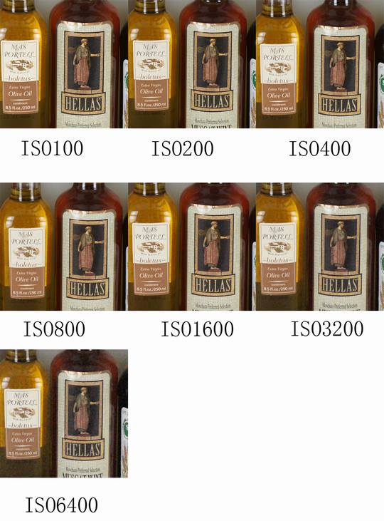 将α850 与 5D MK2的各档ISO对比,上为α850,可以看出,在低ISO下两款相机均有优异的画质表现,而在高ISO下5D2以明显优势胜出。