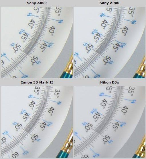 在成像细节上我们将α850分别于α900、5D2以及D3X进行了对比。