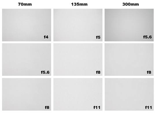 对适马70-300/4-5.6 DG OS做了暗角测试(带遮光罩),70mm在f/4时有比较明显的暗角,f/5.6时暗角就已经很微弱,135mm暗角表现则非常理想,最大光圈处有轻微暗角现象,收到f/5.6已经看不到暗角了,而300mm大光圈失光明显。本组测试图使用测光表测光,通过互易率来实现不同光圈下的曝光,但300mm最大光圈下明显表现较暗,而收小一档光圈进步非常明显,已无暗角。