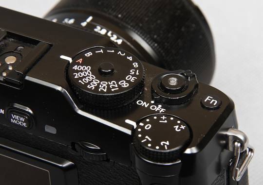 顶部X-Pro1设置了两个转盘,大一点的是快门+模式转盘,这个转盘充分体现了与现代相机模式转盘的不同,感觉很“徕卡”,其中A就代表的是光圈优先。