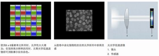 富士X-Pro1的X-Trans CMOS传感器改变了传统的彩色色彩滤镜阵列,通过增强阵列排列的无周期性(无序性),彩色色彩滤镜减少大幅度降低了摩尔纹和杂色的产生,这样在镜头中便无需光学低通滤镜使得X-Trans CMOS传感器能够捕获完整的、“未经过滤”的镜头性能。
