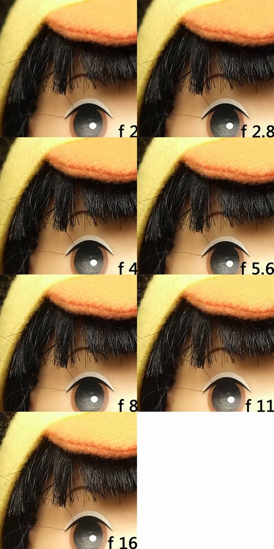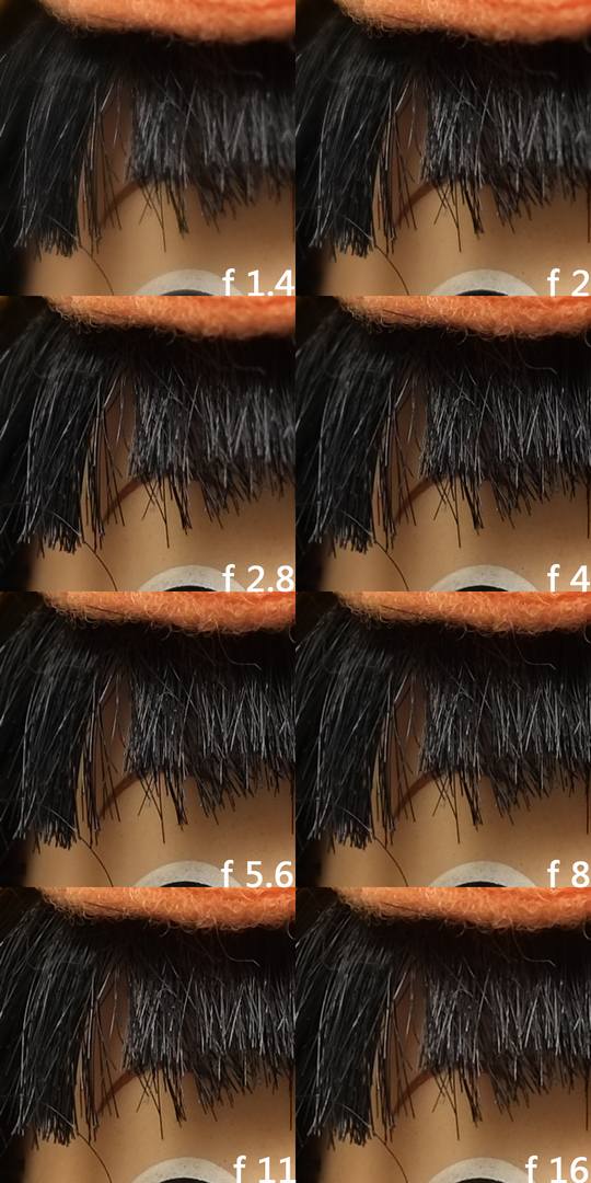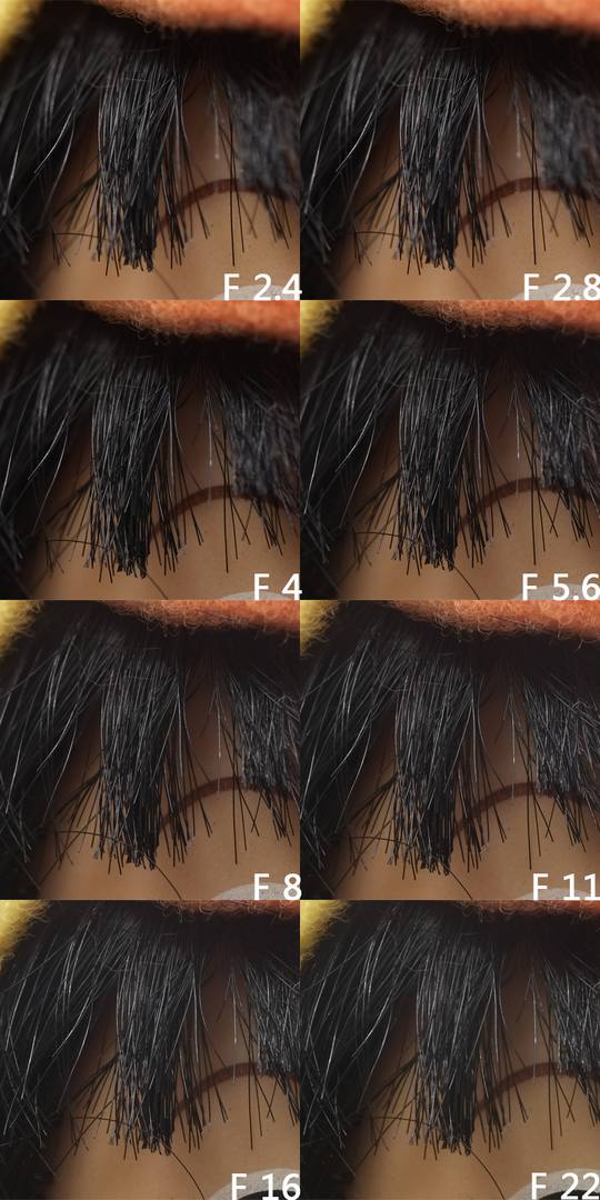 从上图可以看出,F2光圈下镜头的锐度有稍许的偏肉,并不算锐利,从F2.8以后明显好转,从F4到F11头发丝的表现很是惊艳,看到去处低通滤镜以后随画面的锐度确实起到了很大的改善作用。F16光圈下锐度稍有下滑趋势。