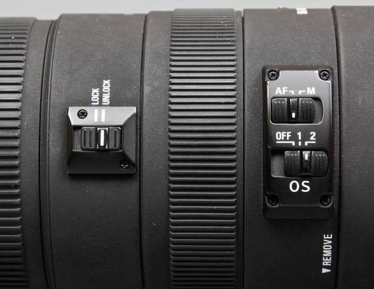 镜头上提供了三个拨杆,左边的为镜头变焦锁,可以锁定标准焦段,防止镜头镜筒的滑落。右边的OS字样拨杆为防抖开关,此只镜头提供了两档防抖选项,官方称可以提高4档快门,建议使用者常开防抖选项,毕竟照片还是要以清晰为主。另一个拨杆是大家都熟悉的自动对焦与手动对焦切换拨杆。