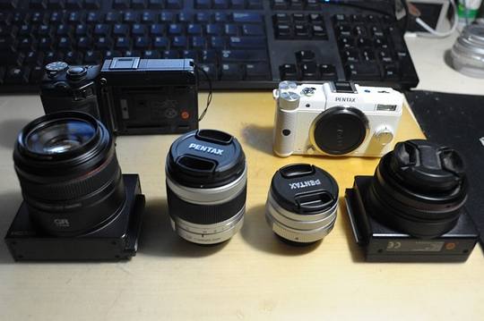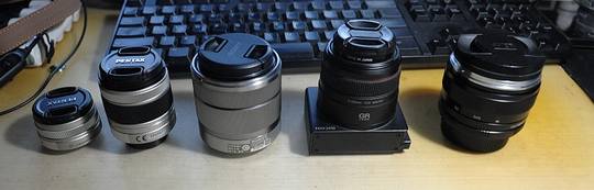 从左往右依次 Q8.5mmF1.9 、 Q5-15mmF2.8-4.5 、 E口18-55mm 、 gxr a12 50mm  、 ZF 50mm F1.4,可以看出这有多小了~