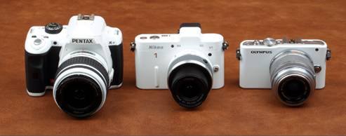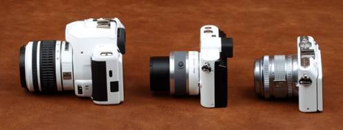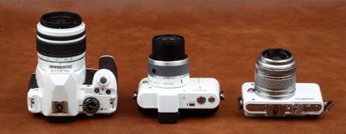 无论是技术的原因还是为了保持握持存在感的原因,V1的体积并不算小巧(和M4/3相比的)。正好我的办公室有其他牌子的DSLR和微单(正好也是白色版的),拍几张外观照片大家可以比较一下大小。