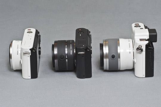 和其他无反相机相比Nikon 1系统的两款相机机身体积不算最小,尤其是带取景器的V1,这应该和它内置的电池(EN-EL15)有关,这个我们后面再讨论。作为主攻消费者目标人群的J1,其体积比部分使用更大尺寸传感器的无反相机在某些尺寸上还稍微大一些,读者也许会疑问到底使用更小尺寸传感器的体积优势在哪里? 答案是镜头,因为成像面积减少和相应的法兰距离(镜头卡口到传感器表面)减少到17mm,Nikon 1的镜头在整体体积上有明显优势,下里我们把Nikon 1和其他几个无反相机进行对比:广角定焦镜头(饼干头)、标准变焦镜头、望远变焦镜头。
