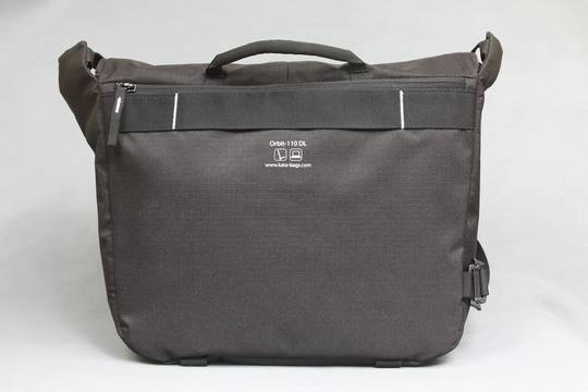 卡塔Orbit-110 DL的背面设计简洁,白字部分标注了此款包的型号,下面两个图标注明了这款包的两个特点:可以搭配专门拉杆(需单独购买)而进化成拉杆箱(两条竖白线部分),另外一个特点是可以放进笔记本电脑。